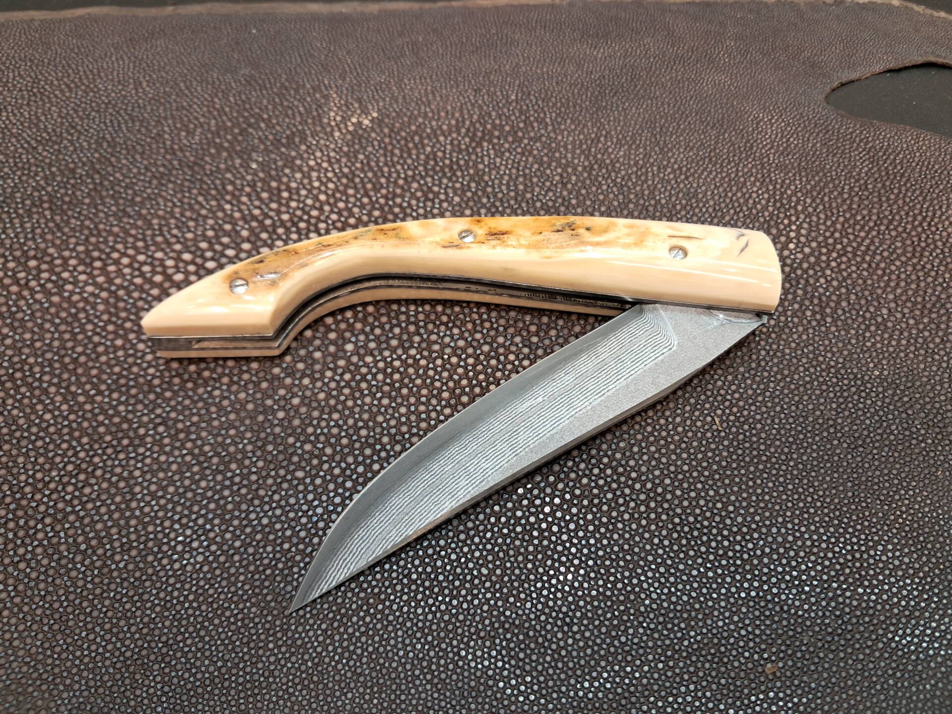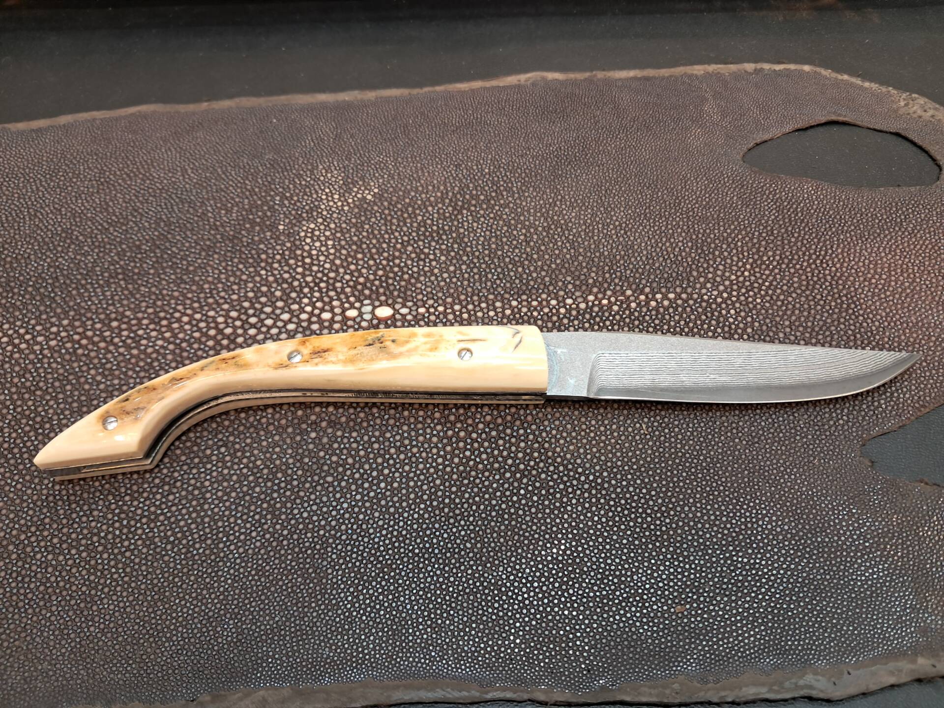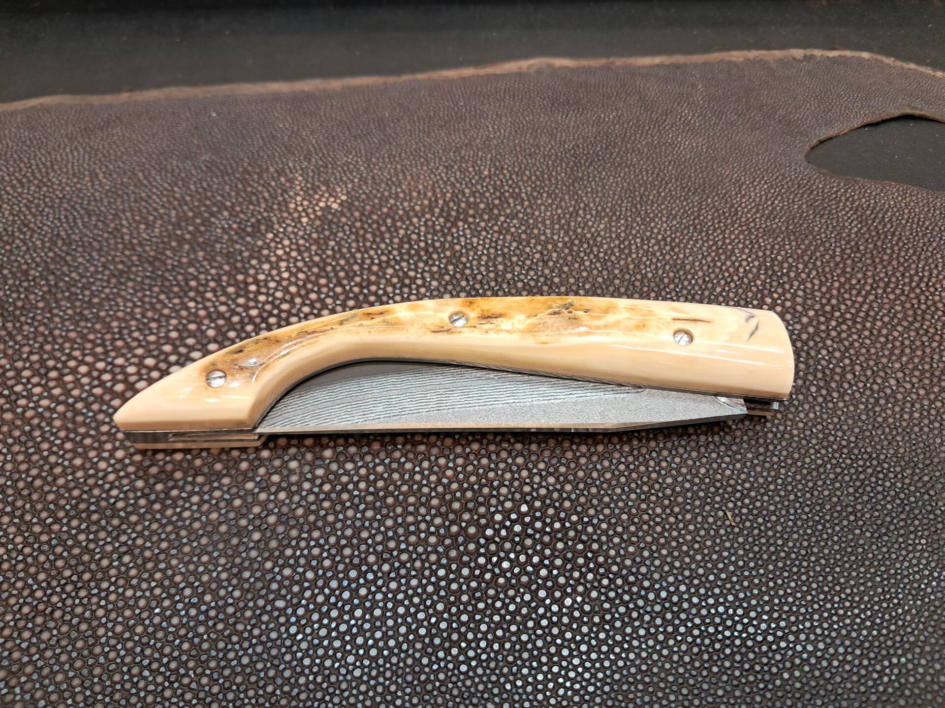 Le manche de 13,5 cm est façonné en défense de mammouth, un matériau rare et prestigieux, ici sélectionné pour la beauté de ses nuances. Chaque pièce étant unique, ce couteau possède une véritable identité propre.