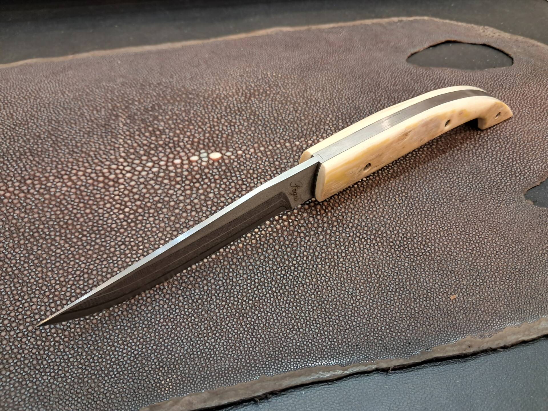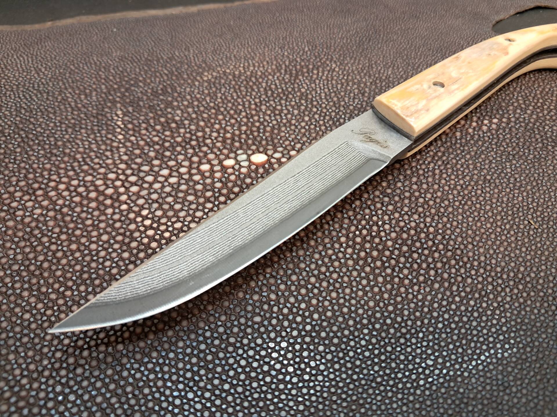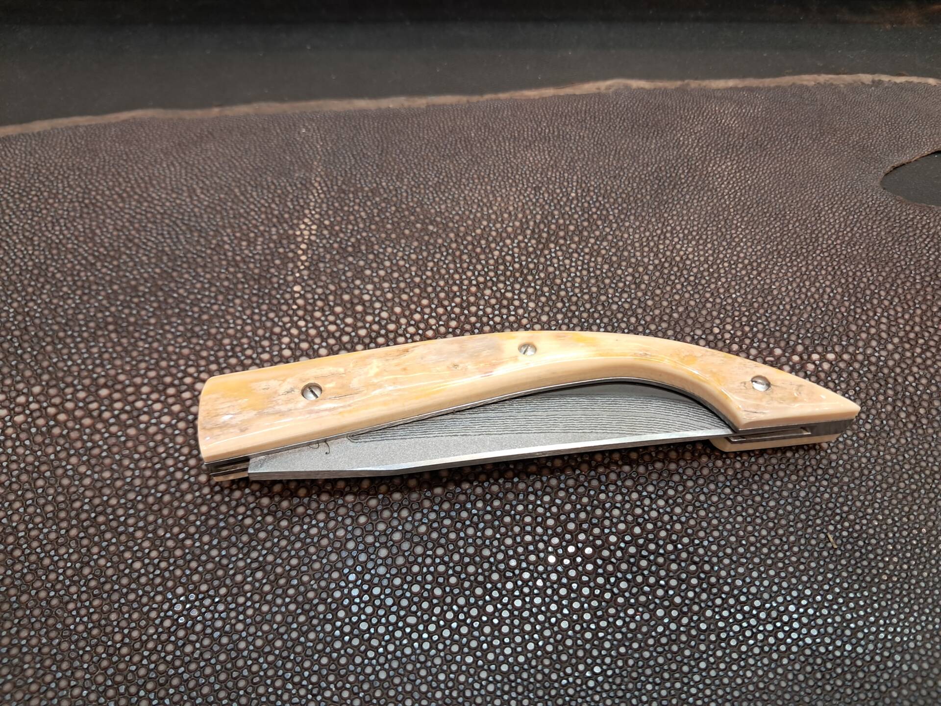 Le manche de 13,5 cm est façonné en défense de mammouth, un matériau rare et prestigieux, ici sélectionné pour la beauté de ses nuances. Chaque pièce étant unique, ce couteau possède une véritable identité propre.