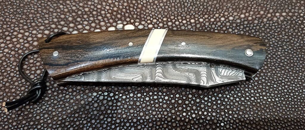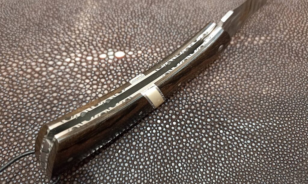 - Manche élégant de 11,5 cm en bois de ziricote, orné d’une incrustation centrale en ivoire de mammouth.