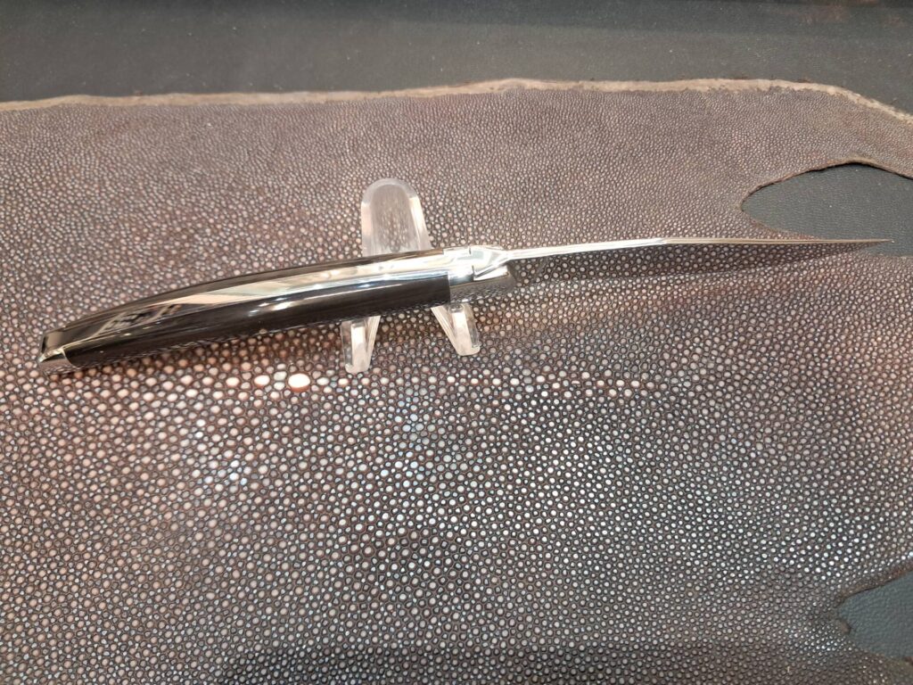 Sa lame de 10 cm de tranchant est forgée en acier T12 et bénéficie d’une finition poli miroir, offrant une excellente qualité de coupe ainsi qu’un rendu visuel haut de gamme.